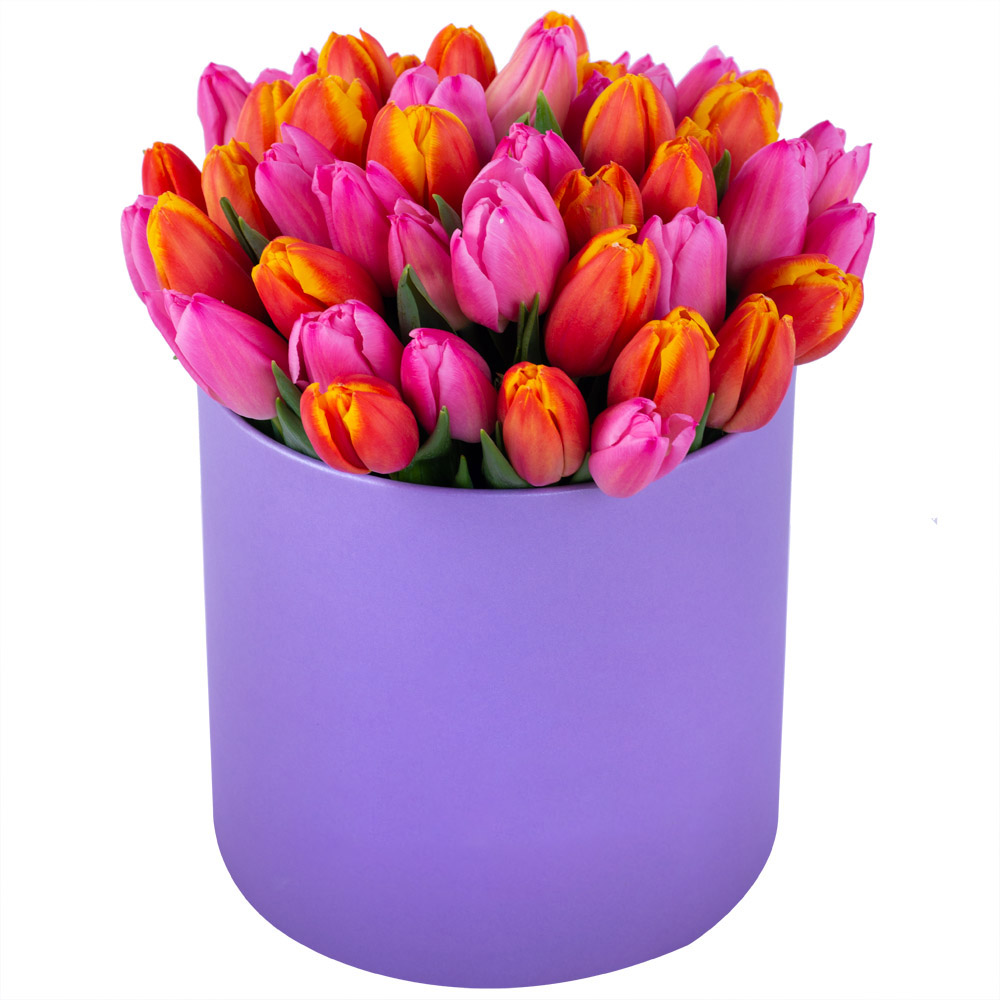 Букет микс из 51 тюльпана в фиолетовой шляпной коробке