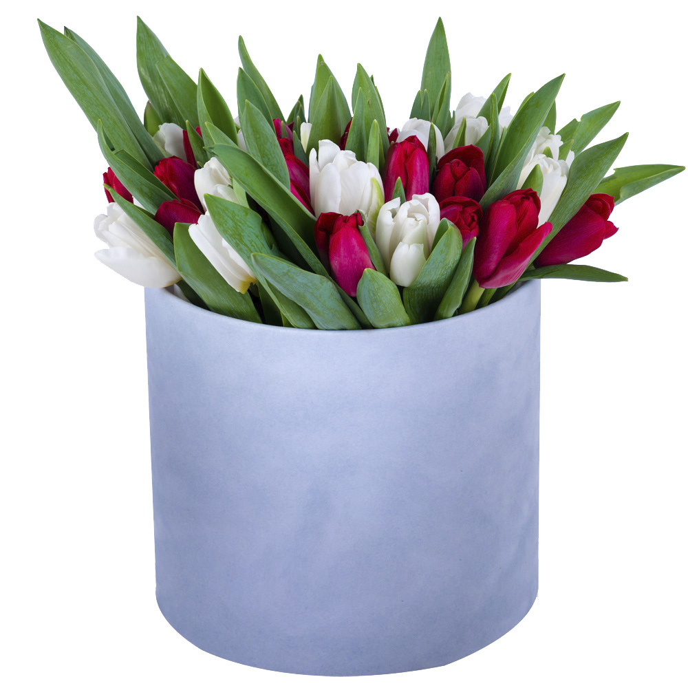 51 Разноцветный тюльпан в серой бархатной шляпной коробке