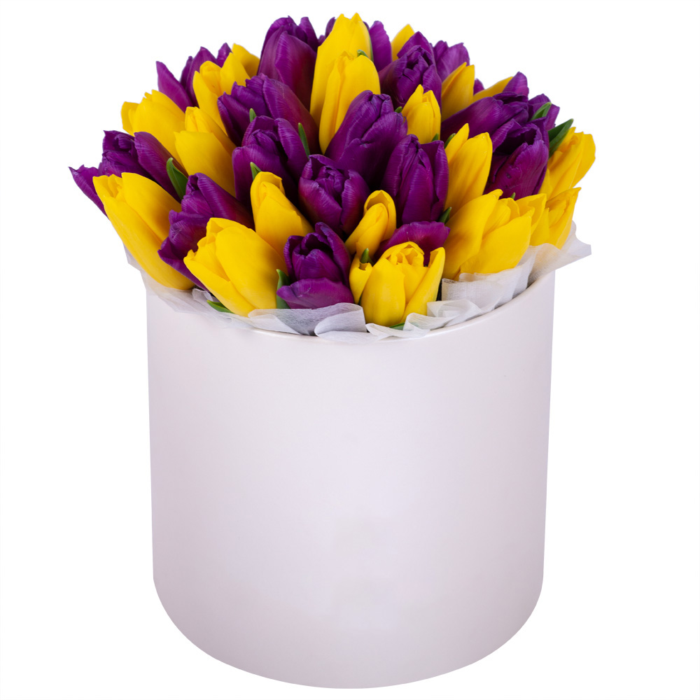 35 разноцветных тюльпан в кремовой шляпной коробке