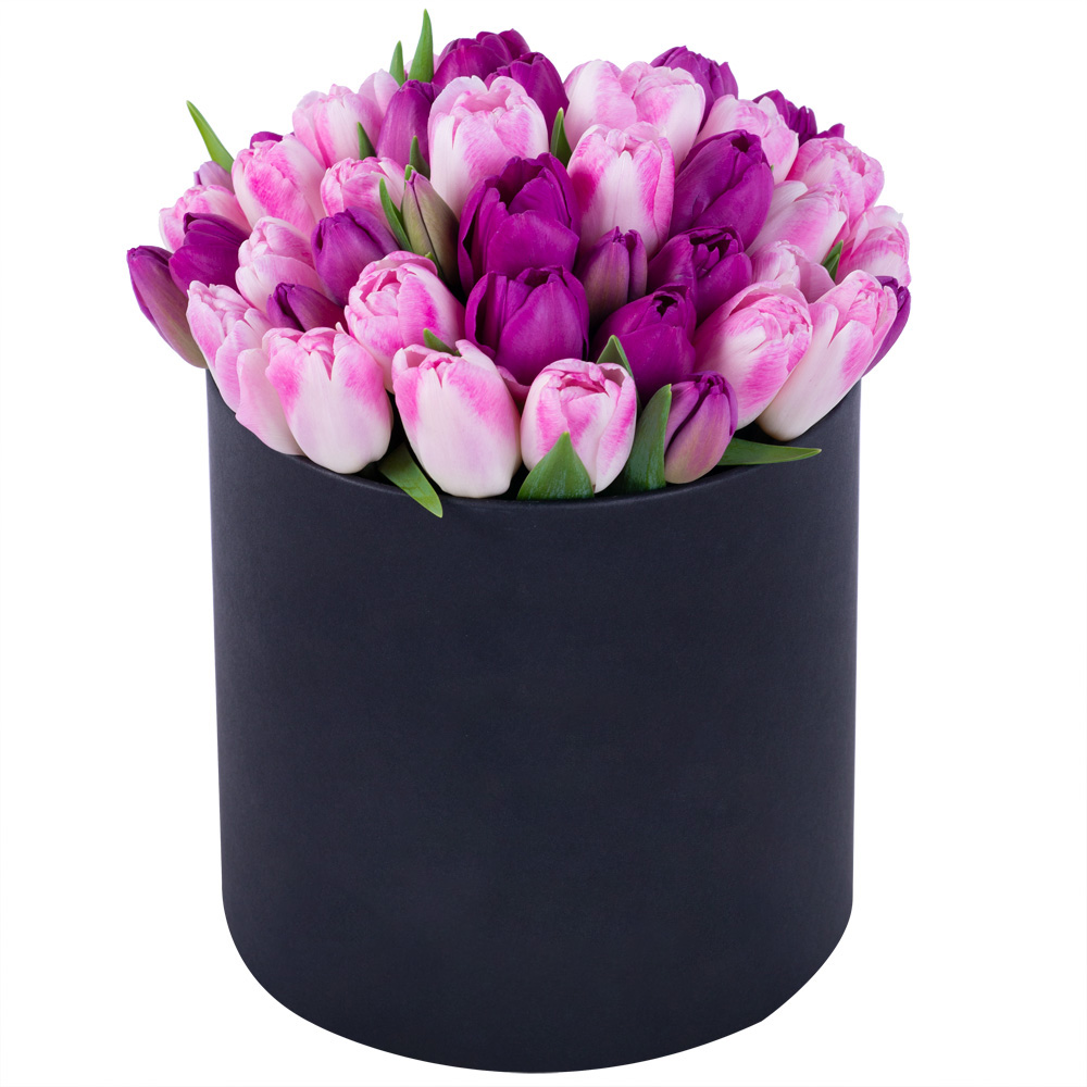 Разноцветный 51 тюльпан в черной шляпной коробке