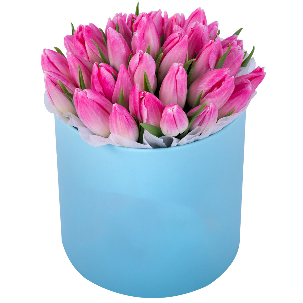 35 розовых тюльпан в голубой шляпной коробке