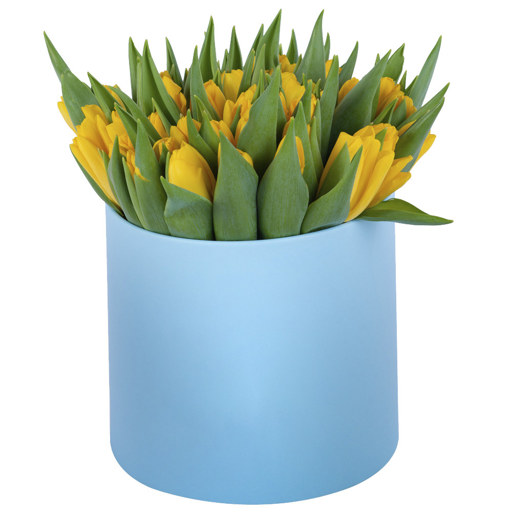 51 желтый тюльпан в голубой шляпной коробке