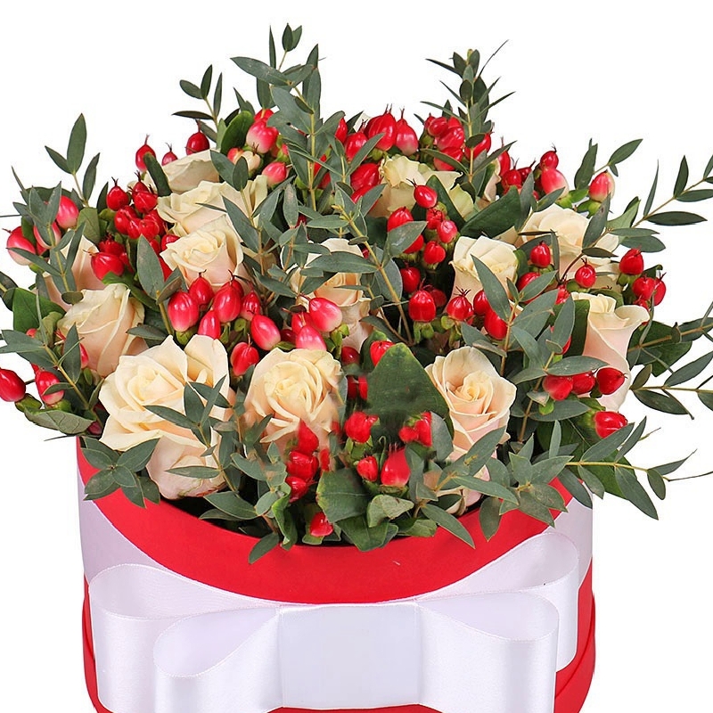 Букет состоит из 15 кремовых роз, 6 веток гиперикума, эвкалипт, коробка, оазис, атласная лента.