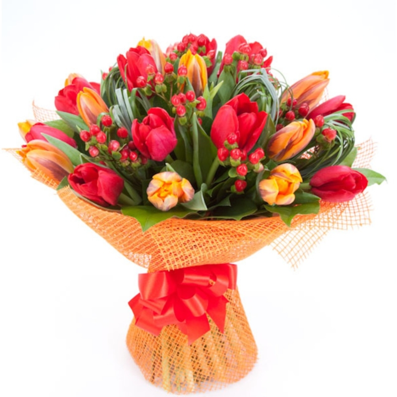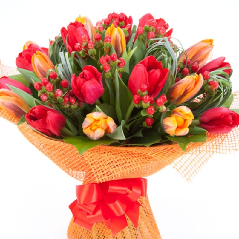 Букет состоит из 21 разноцветный тюльпан, 9 гиперикум, зелень, упаковка, лента.