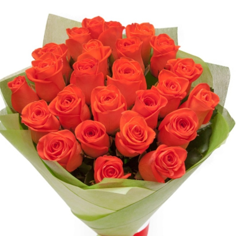 Букет состоит из 25 коралловых роз, красивая упаковка, атласная лента.