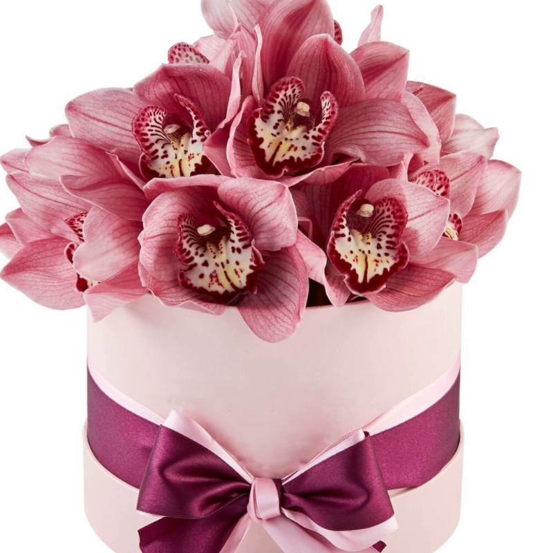 Букет состоит из 15 орхидей, коробка, оазис, атласная лента.
