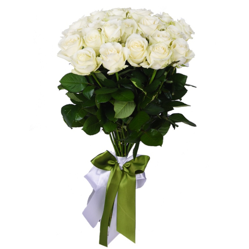 Букет состоит из 21 белая роза, лента.