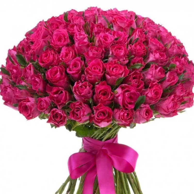Букет состоит из 101 малиновая роза, прозрачная упаковка, атласная лента.