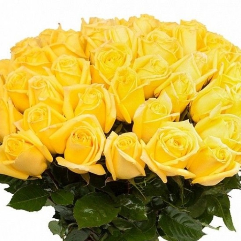 Букет состоит из 55 желтых роз, прозрачная упаковка, атласная лента.